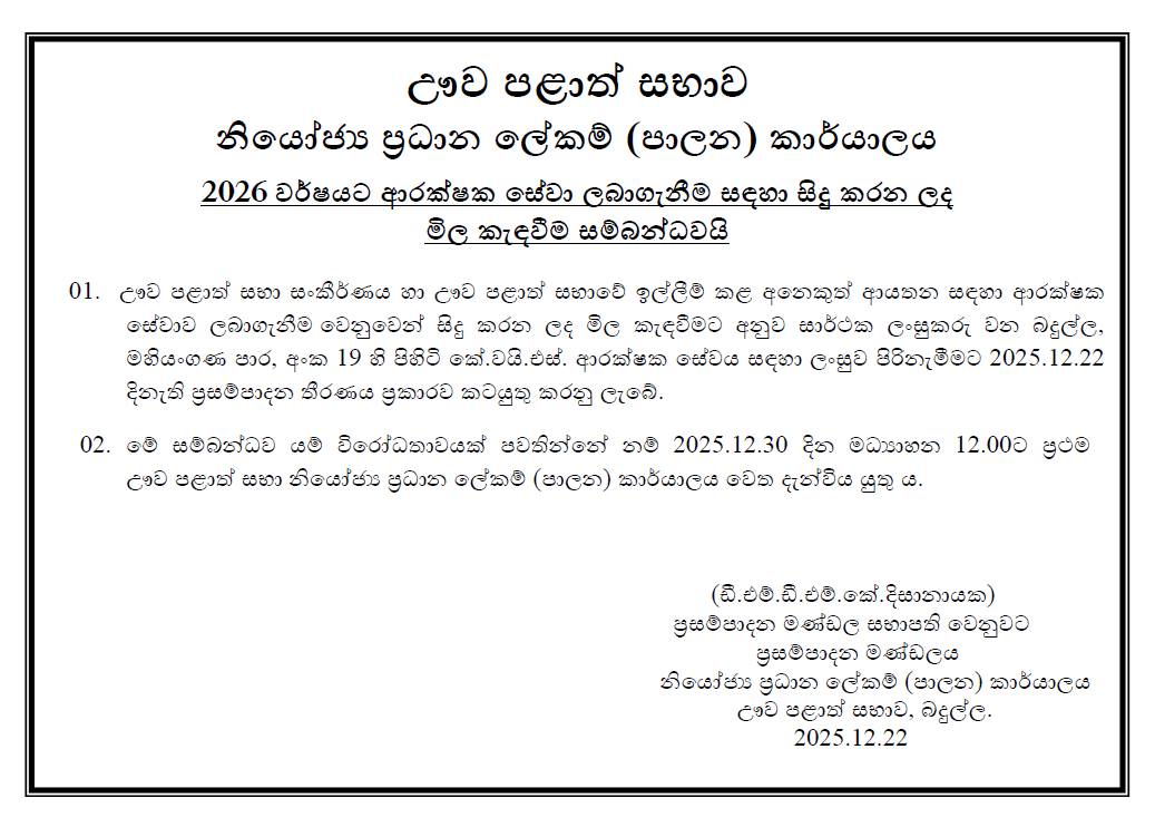 ආරක්ෂක සේවා සඳහා මිළ ගණන් කැඳවීම – 2026 by chanaka | Dec 23, 2025 | නිවේදන හා සිදුවීම්, පුවත්, ප්රසම්පාදන | 0 comments 2026 වර්ෂයට ආරක්ෂක සේවා ලබාගැනීම සඳහා සිදු කරන ලද මිල කැඳවීම සම්බන්ධවයි Submit a Comment Cancel replyYour email address will not be published. Required fields are marked *Comment Name * Email * Website